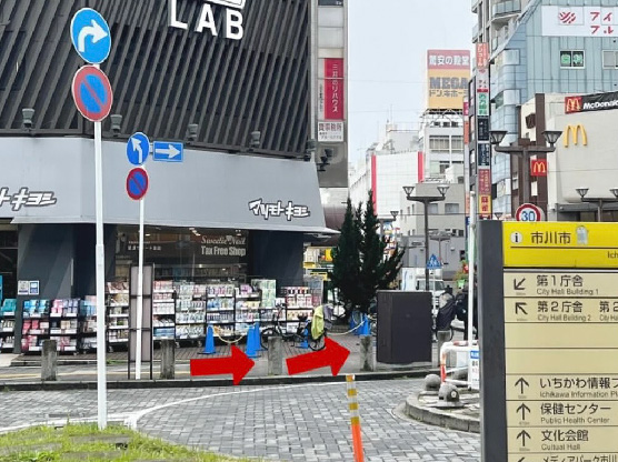 ①JR本八幡駅南口に出て、ロータリーを左回りに進み、