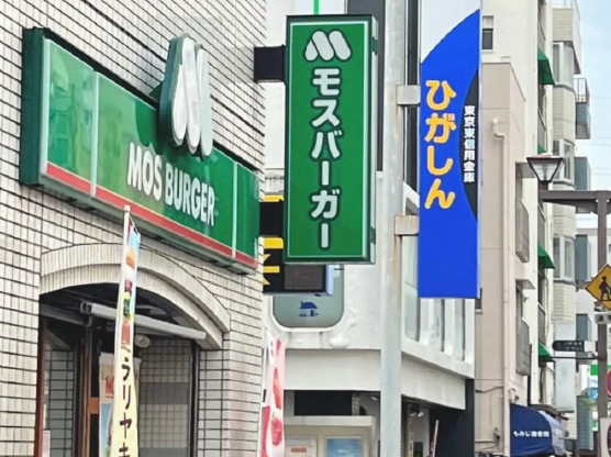 ④「モスバーガー」「ひがしん」を越えます。